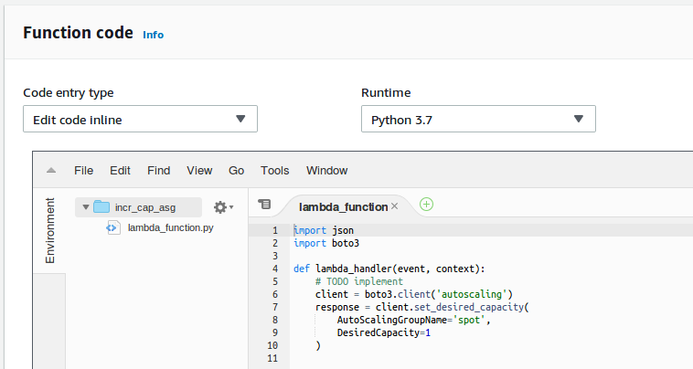 This code increases the desired capacity of ASG with name ‘spot’ to 1.