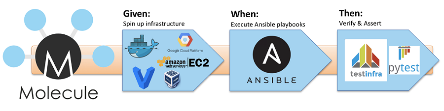 “When we setup molecule a directory with name “molecule” creates inside ansible role directory then it reads it’s main configuration file “molecule.yml” inside molecule directory. Molecule then creates platform (containes/Instances/Servers) in your local machine once completed it executes Ansible playbook/role inside newly created platform after successful execution, it executes test cases. Finally Molecule destroy all newly created platform”