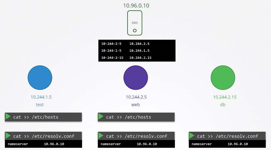Like I said above that we change the entry of /etc/hosts to centralised DNS server. Well, it is right but partially. DNS does not do the entry of pods as we do by editing /etc/hosts file in pods (Format: <pod_name> <IP>). Instead, it creates a new hostname by replacing dots into dashes in the IP address of pods like hostname 10-244-2-5 (Format: <hostname> <IP>). Refer figure 1d and look at the entry of DNS.