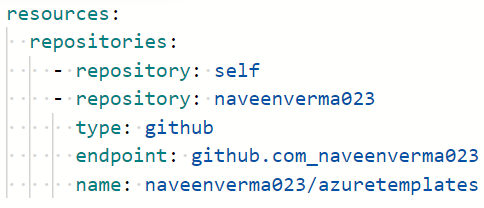 - Now we just have to refer this template repository in our pipeline script the same way we did for our github repository, the only differences would be that we will only be using ‘git’ in the ‘type’ parameter and we won’t be specifying any endpoint because our entire setup is in Azure.