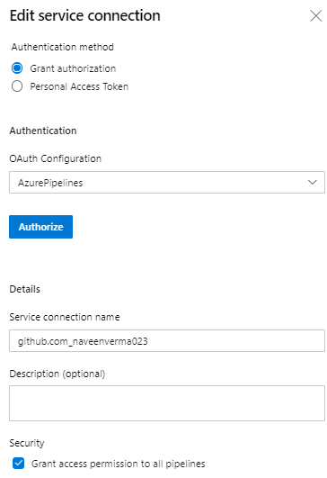 - Navigate to your ‘Project Settings’, there setup a new github service connection and use the token created in the above step