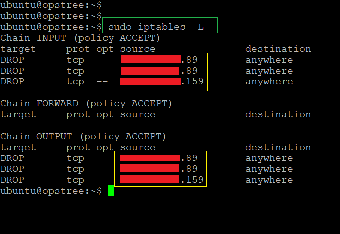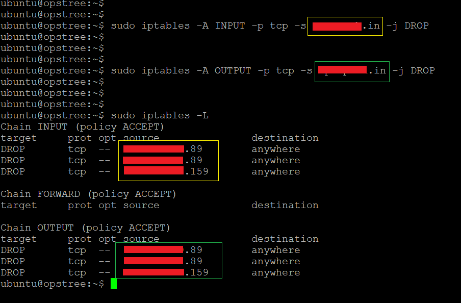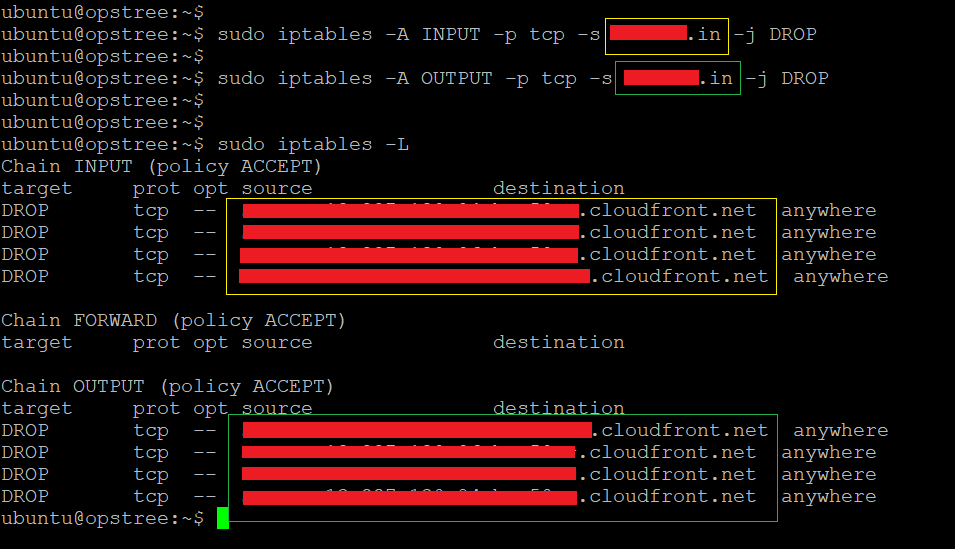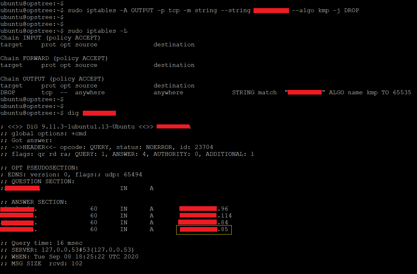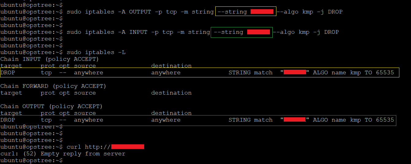 In the above example, iptable utility applies the rule to the “domainname.com” string rather than the IP address. So, next time any URL or packet contains that specific string it will block by iptable filter rules but this filter type that has its own drawback. If somebody uses the IP address directly that would be bypassed.