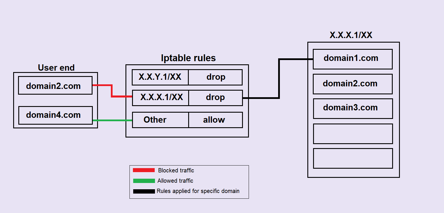 In the above diagram, the black line show’s that we applied the rule for “domain1.com” and as we applied the rule for a domain name, the rule applied to the public IP that specific domain is attached to. So, because of this, the user will not be able to access the “domain2.com” site that is hosted on a server whose IP got dropped or blocked by iptable rules on the server and so on.