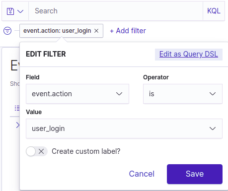 Let’s see various login attempts made on our instance. Use and set event.action to user_login.