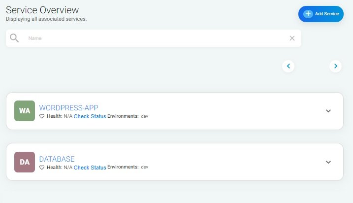 After setting up both database & WordPress application services using BuildPiper, we can click on a service overview to view all services configured.