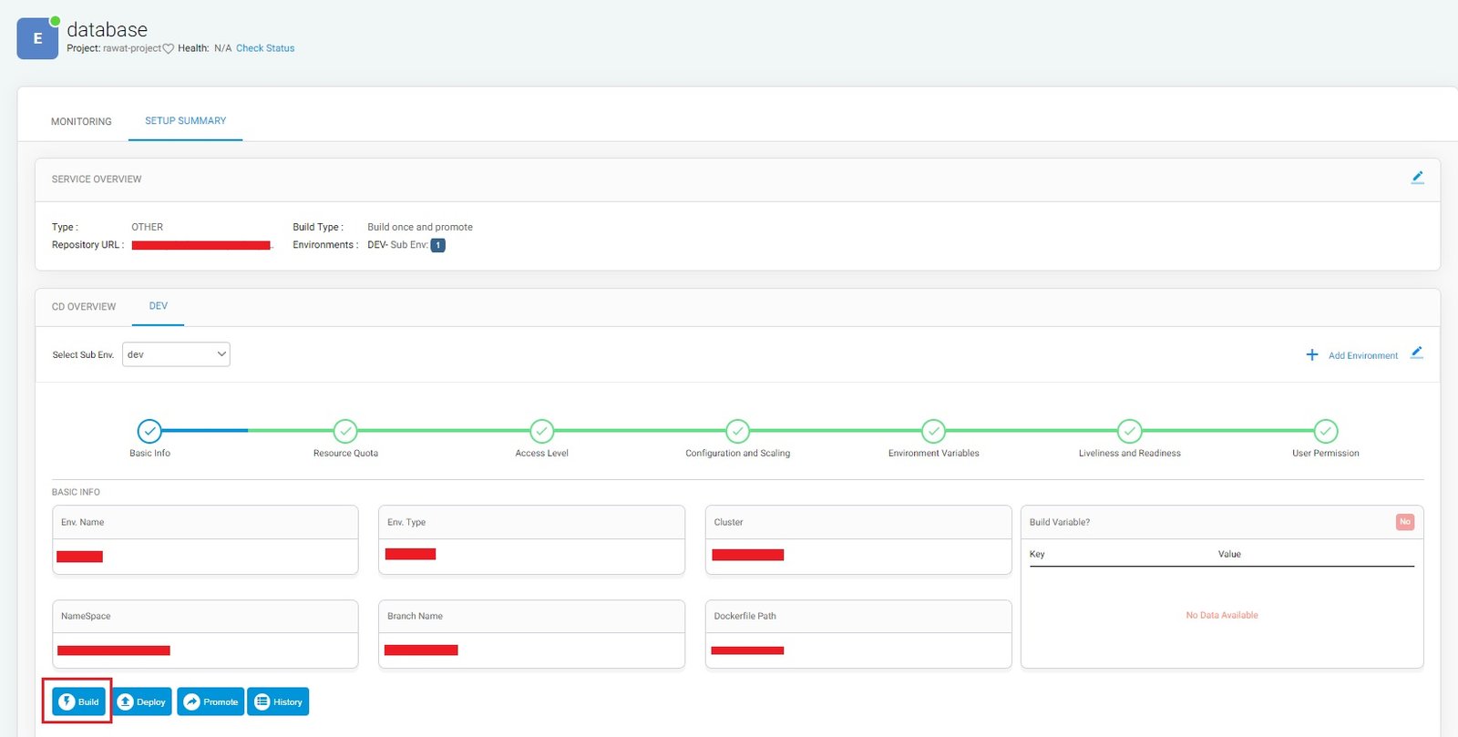The second part contains information about build variables and CI [ continuous integration ] information for service.