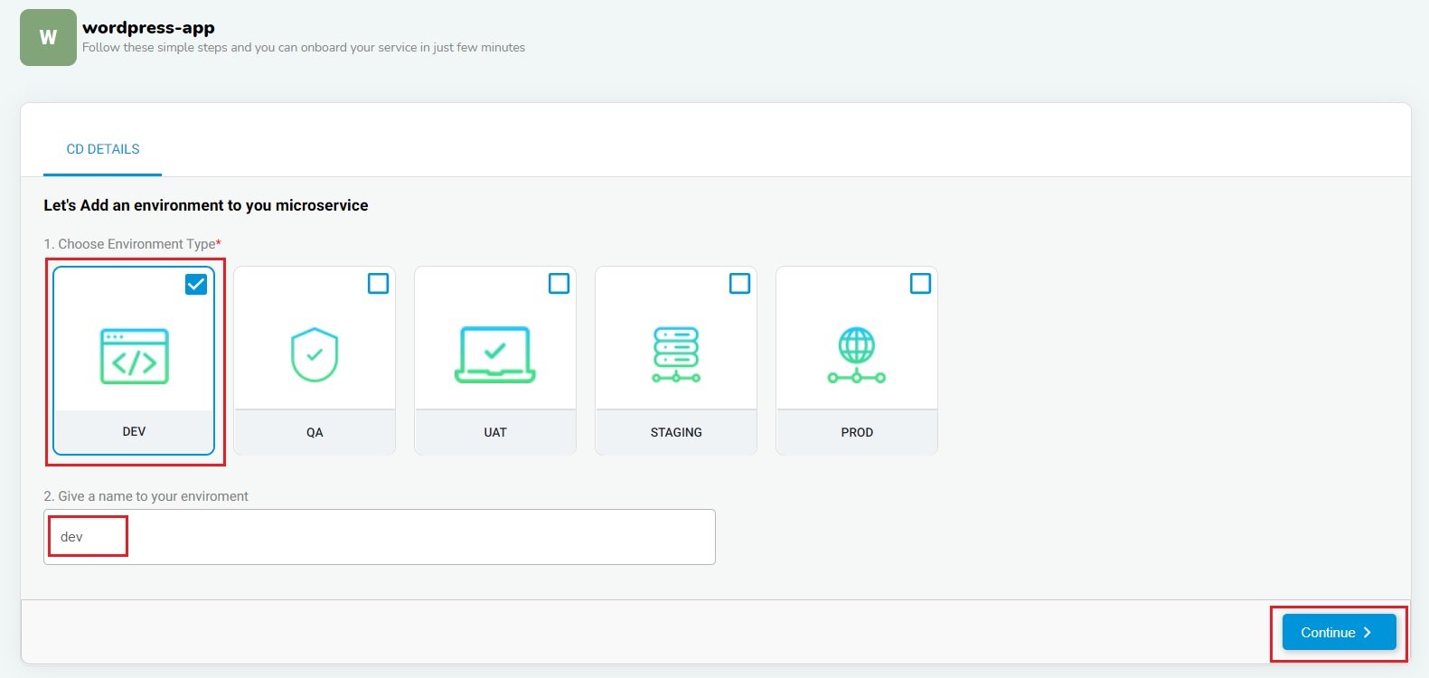 Now, we have to provide an environment type for microservice as BuildPiper supports multiple environments.