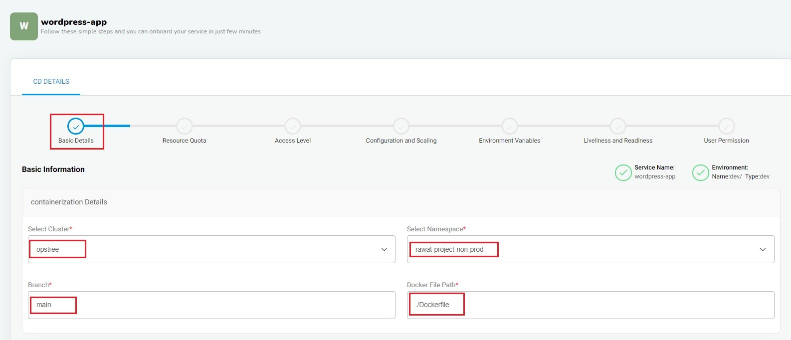 First, we have to provide the service details for container service like