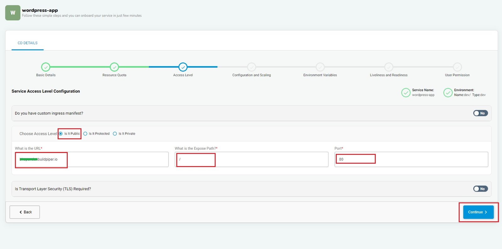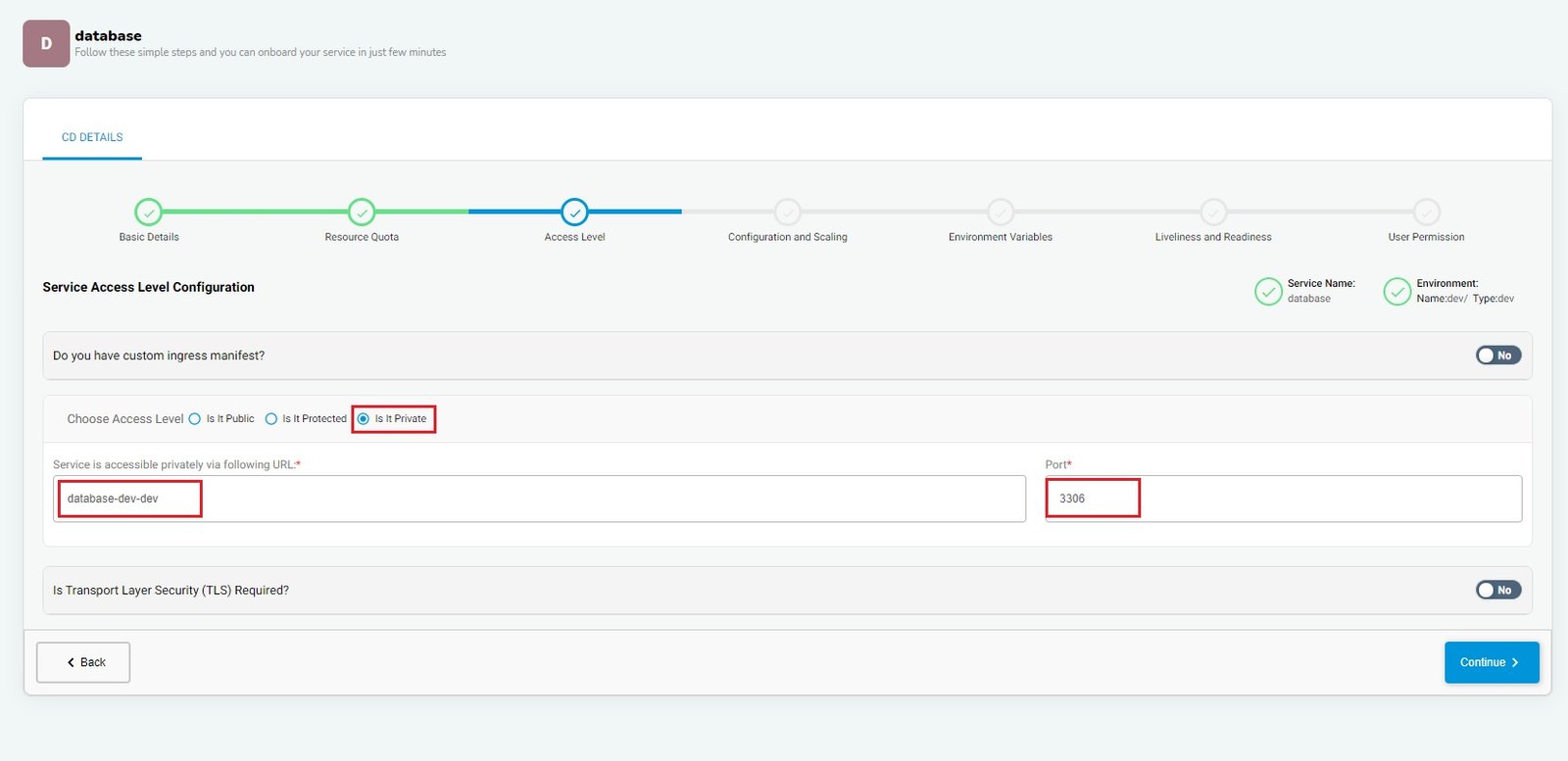 For database pods, we need private access from our application. For this, we will choose private as ‘Access Level’ and provide the name/URL for the database along with the port which is used as build variables for the WordPress application.