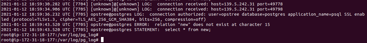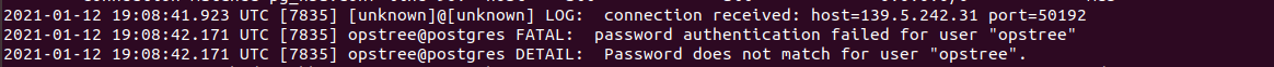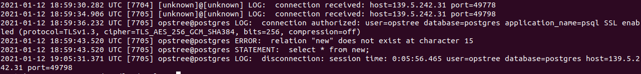 Here as you can see, I have remotely tried to connect my Postgres server. My Public IP has been captured. And you can see ‘opstree@postgres’ says command executed by opstree user in Postgres database. My public IP is also captured 139.5.242.31.