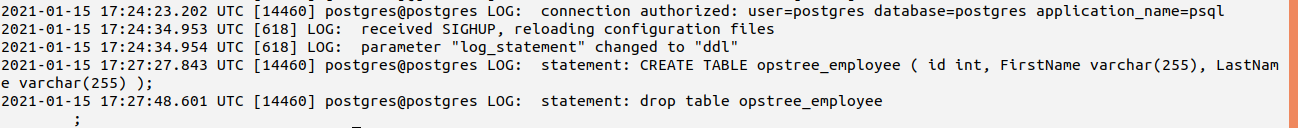 | Ensure ‘log_statement’ is set correctly | none | ddl |