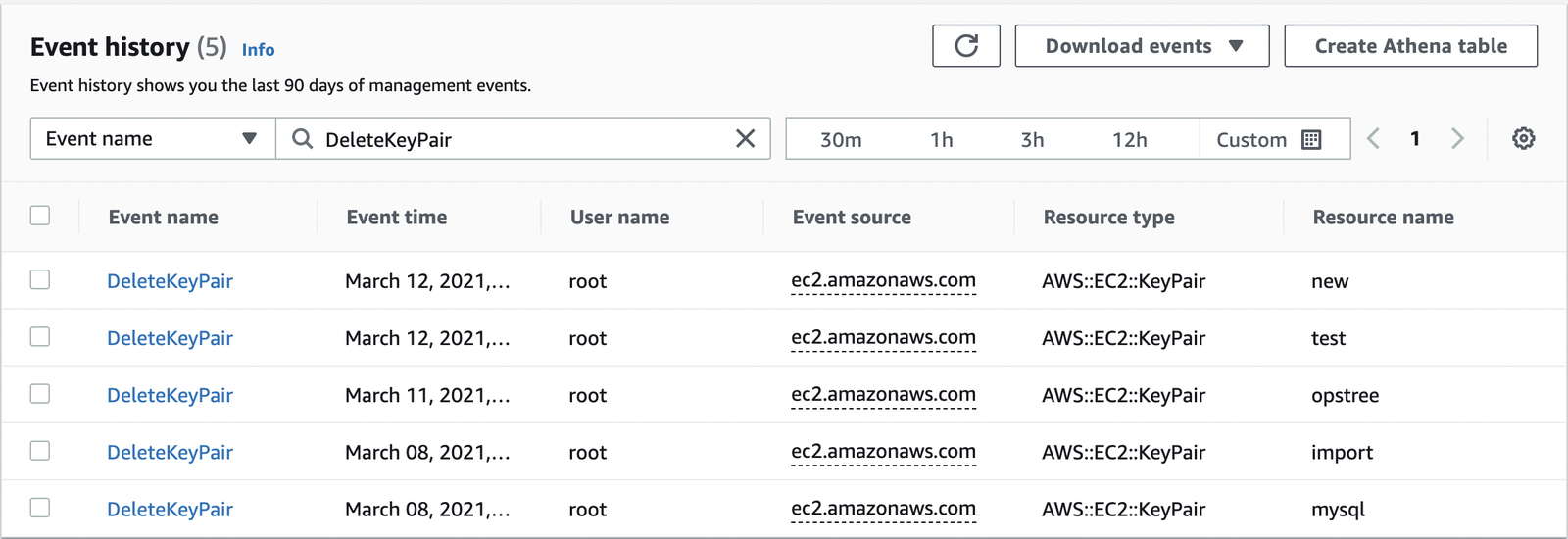 All DeleteKeyPair events that has happend in defined frame will appear.