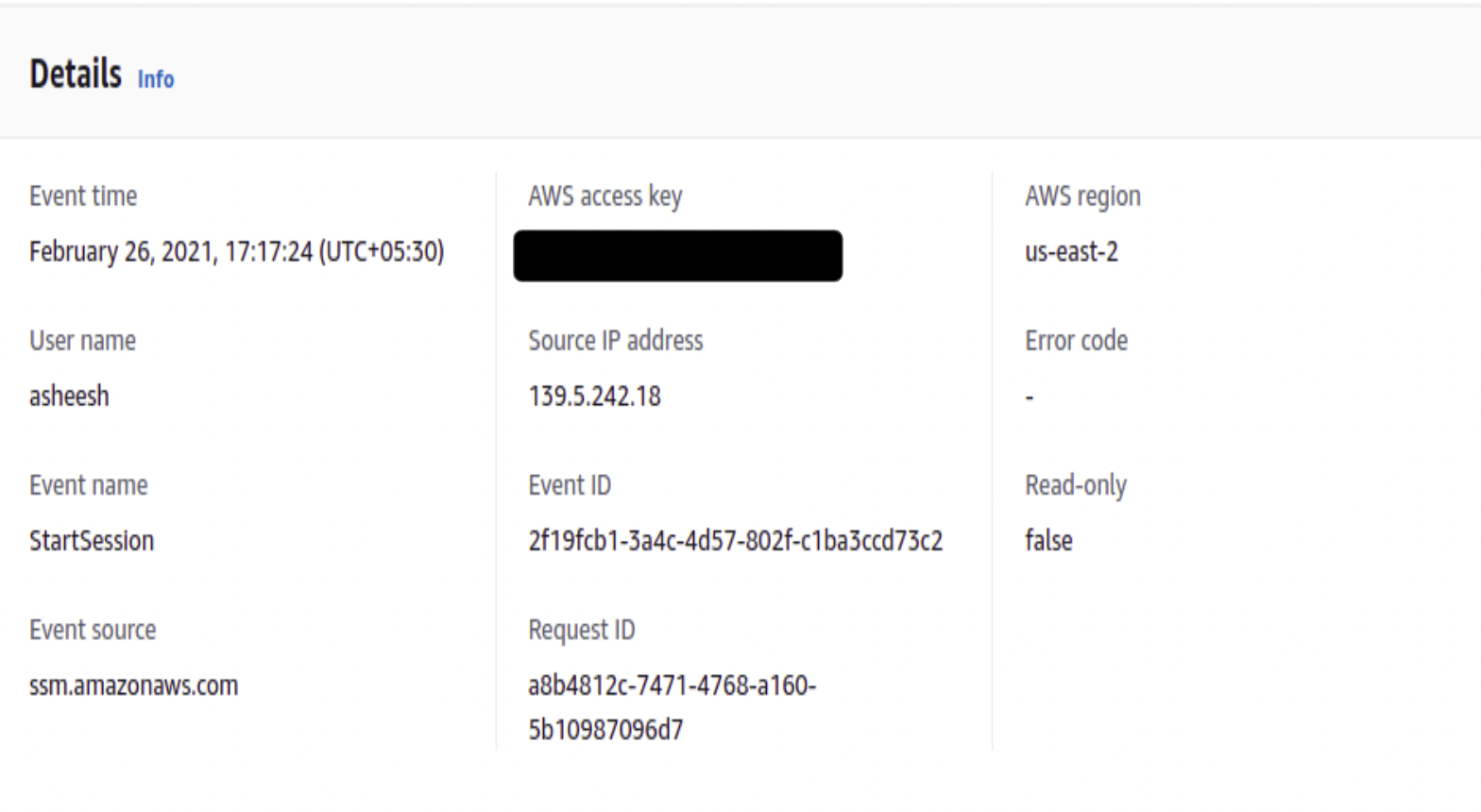 Here you can see requestParameters, it shows parameters which was passed to AWS SSM. In our case, it is target id [ instance-id ].
