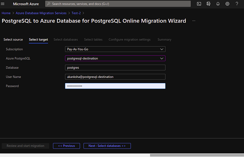 On the Target details screen, specify the connection details for the target server, which is the pre-provisioned instance of Azure Postgresql to which the DVD Rentals schema was deployed by using pg_dump.