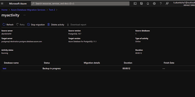 - On the migration activity screen, select Refresh to update the display until the Status of the migration shows as Complete.