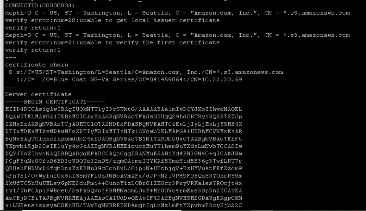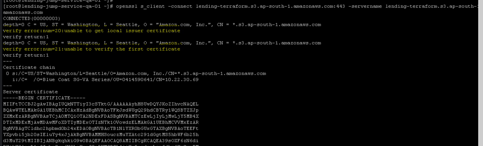 command: openssl s_client -connect bucket_name.s3.ap-south-1.amazonaws.com:443 -servername bucket_name.s3.ap-south-1.amazonaws.com Output: Refer Fig1a and Fig1b
