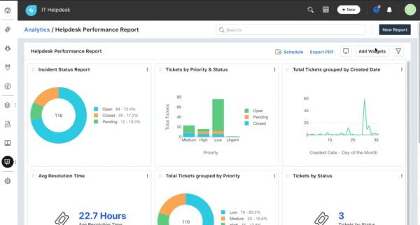 With Analytics, you can pin widgets to a report for monitoring service desk performance. Analytics is used to create an interactive dashboard with the help of widgets. With the help of Analytics, you can add multiple widgets with drag and drop functions in a single fresh service report.
