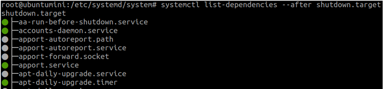 [optional]: Now if you run the command – systemctl list-dependencies --after shutdown.target we will be able to see the service with green (meaning active state) at the top.