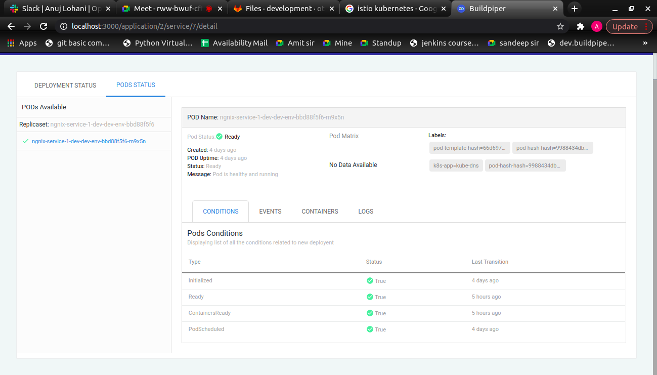 BuildPiper renders a comprehensive overview of pod events, conditions related to pods, number of pods running, and complete health status of the pods. By providing comprehensive visibility into the app, software teams can get granular details of service deployment. This helps teams in finding issues during service deployment and potential reasons for failure if there are any.