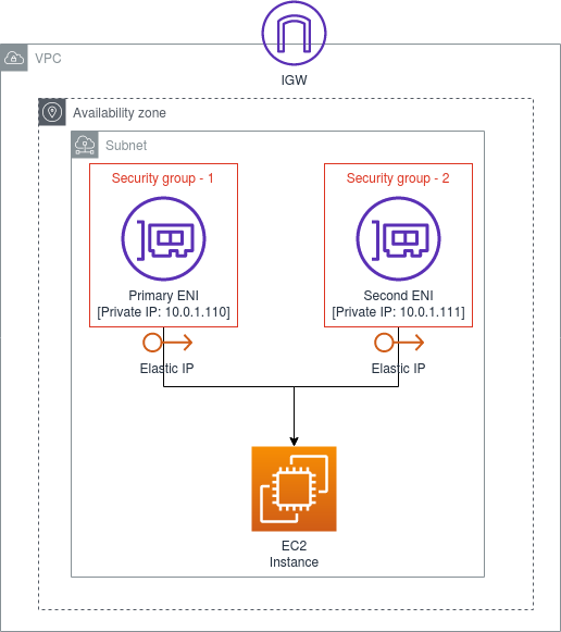 - In addition to the primary ENI that gets created with the instance, we can also attach multiple secondary ENIs to the instance. But the secondary ENI must reside within the same zone and VPC, though it can belong to different security groups.