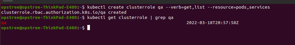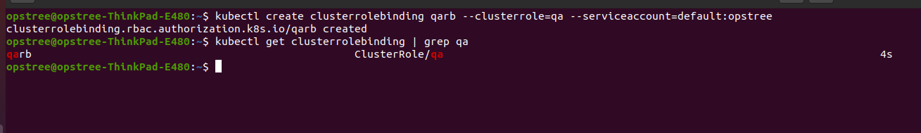 kubectl create clusterrolebinding qarb --clusterrole=qa --serviceaccount=default:opstree