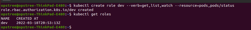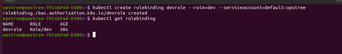 kubectl create rolebinding devrole --role=dev --serviceaccount=default:opstree