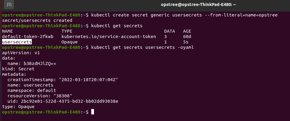 kubectl create secret generic usersecrets --from-literal=name=opstree