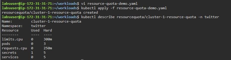 $ kubectl describe resourcequota/cluster-1-resource-quota -n twitter