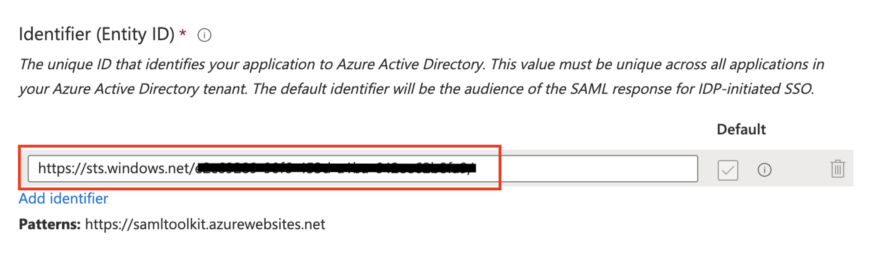 Step 20: Under Identifier (Entity ID), add Azure AD Identifier [ Value 2] from Step 18 that starts with “https://sts”