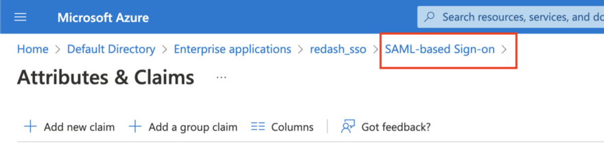Step 11: Once you click on SAML, you will see the option of Attributes & Claims, click to set up new claims which are required for Redash.