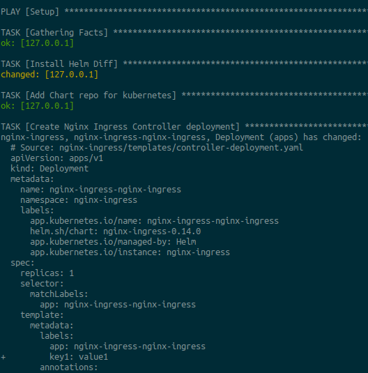 The Ansible helm diff will give users a glimpse of changes that will occur when any changes are applied. This will help to check exactly the modification part rather than having all information or no information.