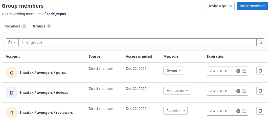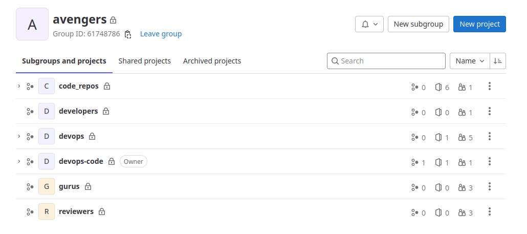For better understanding, we have created a group name avengers with two members name Ashutosh Yadav and Sandeep Rawat, within-group we created a subgroup with the names devops, gurus and reviewers