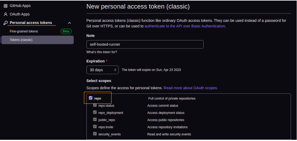 To register the self-hosted runner with GitHub, generate a PAT with the repo scope. Here’s how to generate the PAT: