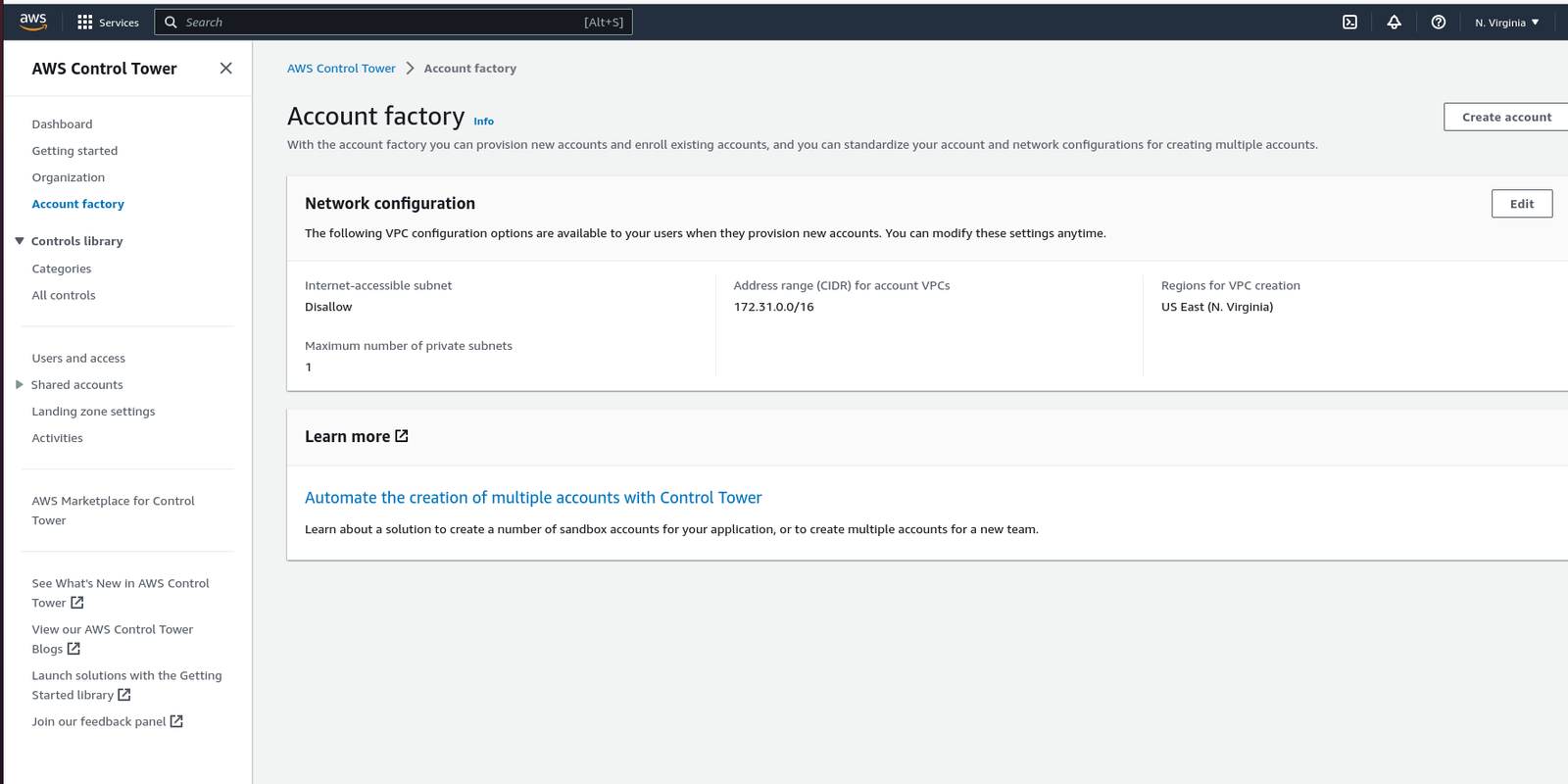 Once AWS Control Tower is set up, you can create, update, unmanaged, close, and move member accounts from one organizational unit to another using AWS Control Tower’s account factory. The account factory allows you to provision new AWS accounts. These accounts will automatically inherit all the policies defined by the management account.