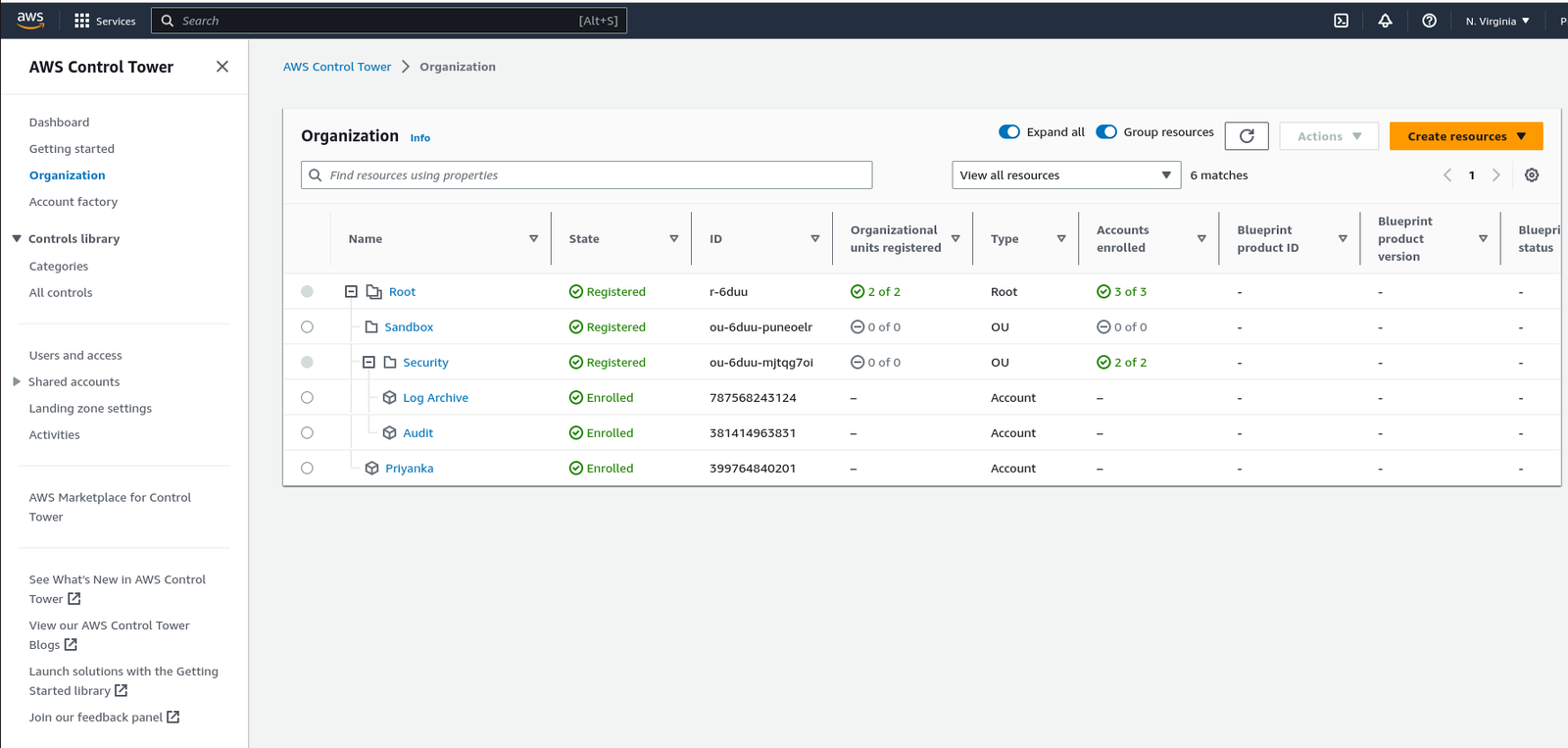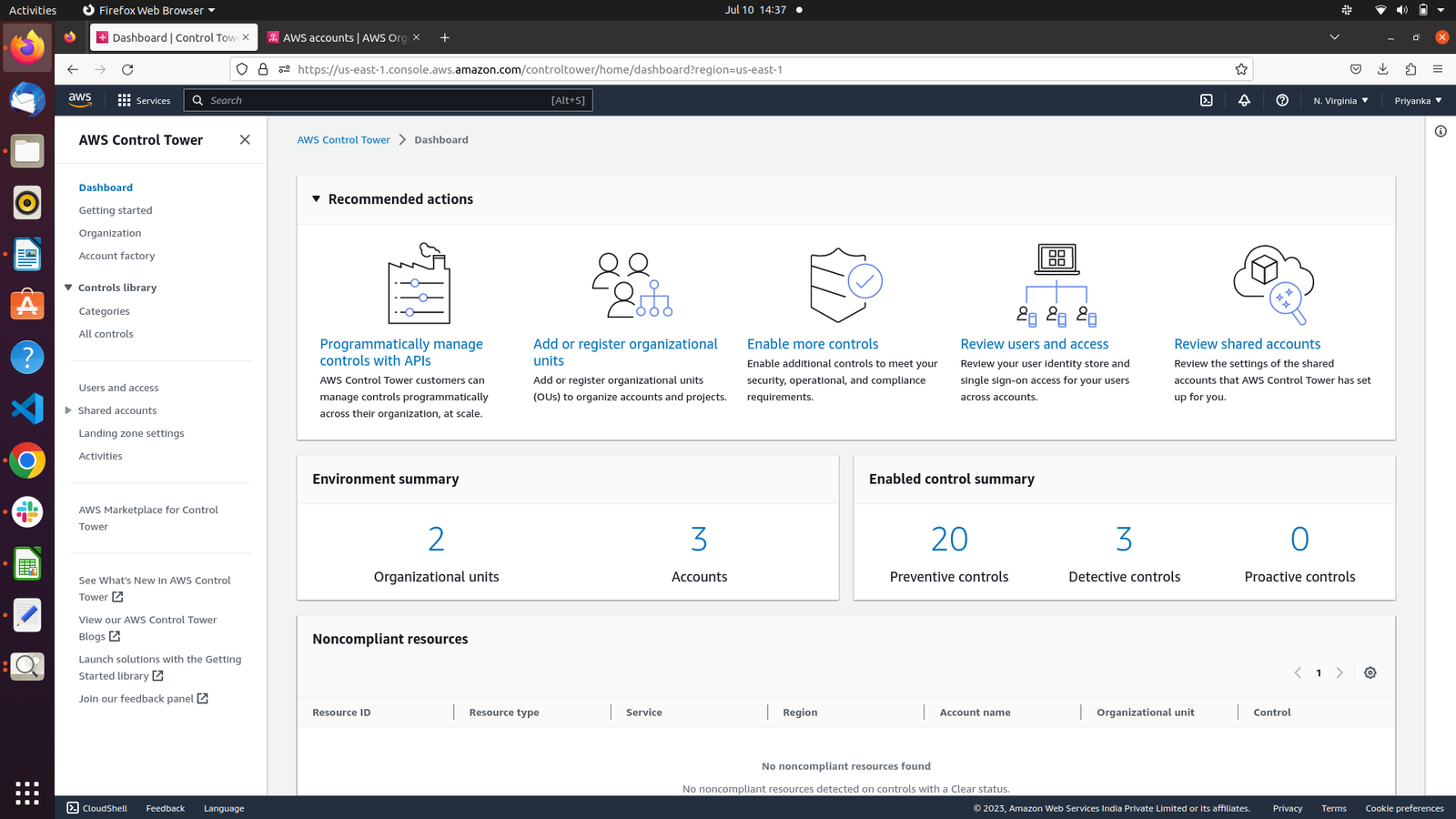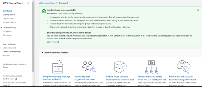 Once the landing zone is created, we can see the dashboard with all the details, such as OU, shared accounts, and controls.