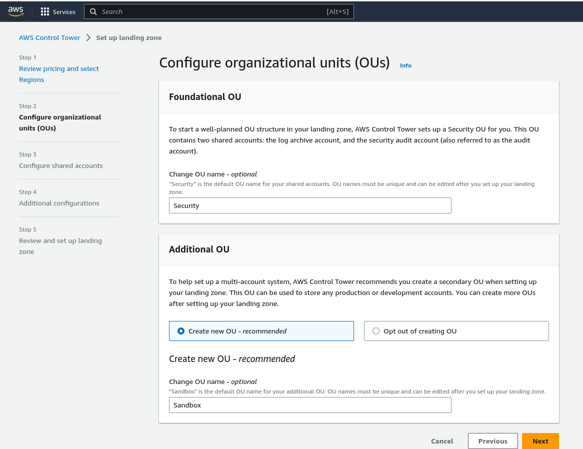 Under this step, we have the Foundational OU that is initially named the Security OU, we can change it or leave it as it is.