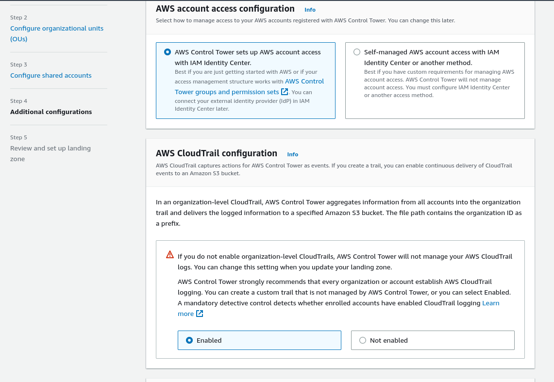 Under this step, you can select whether AWS Control Tower sets up AWS account access with AWS Identity and Access Management (IAM), or whether to self-manage AWS account access—either with AWS IAM Identity Center users, roles, and permissions that you can set up and customize on your own.