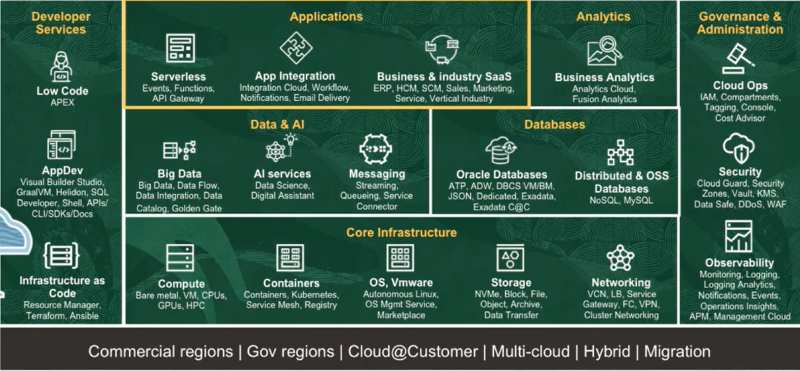 | Core Infrastructure | Foundational cloud services that provide the essential building blocks for creating, managing, and running cloud-based applications and workloads | OCI has a bunch of developer services. they have a managed low code service called APEX, several other developer services, and a managed Terraform service called Resource Manager. |