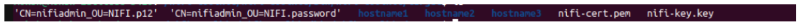 cd nifi-toolkit/bin && ./tls-toolkit.sh standalone -B <cert-password> -C 'CN=nifiadmin, OU=NIFI' -n '<hostname1>,<hostname2>,<hostname3>' --nifiDnPrefix 'CN=' --nifiDnSuffix ', OU=NIFI' -o /opt/nifi-toolkit/target -K <keyPassword> -P <trustStorePassword> -S <keyStore-Password>