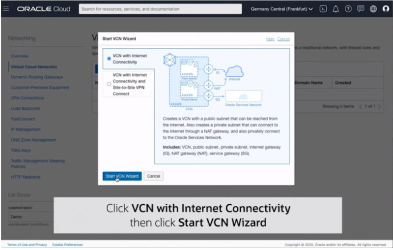 Click VCN with Internet Connectivity then Click Start VCN Wizard