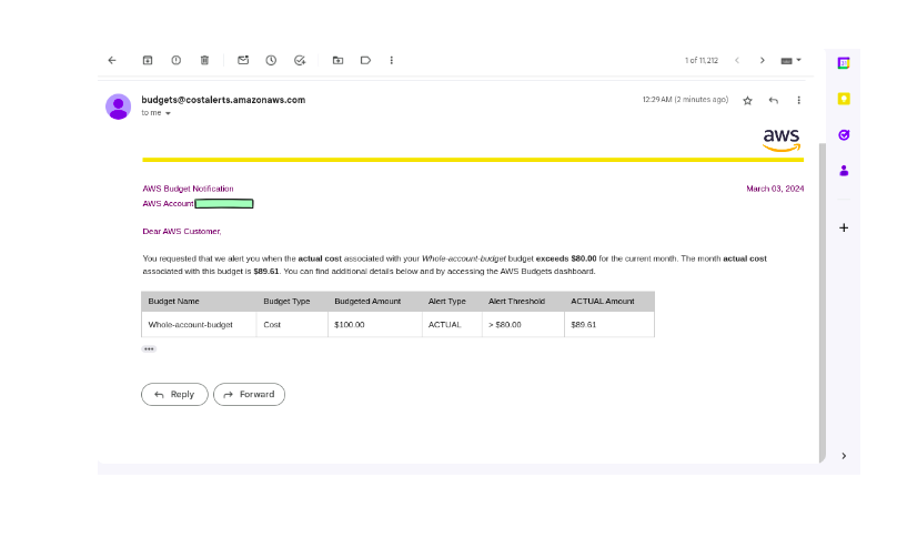 So, if the budgeted amount exceeds the threshold, you will receive an email within a few seconds as shown below: