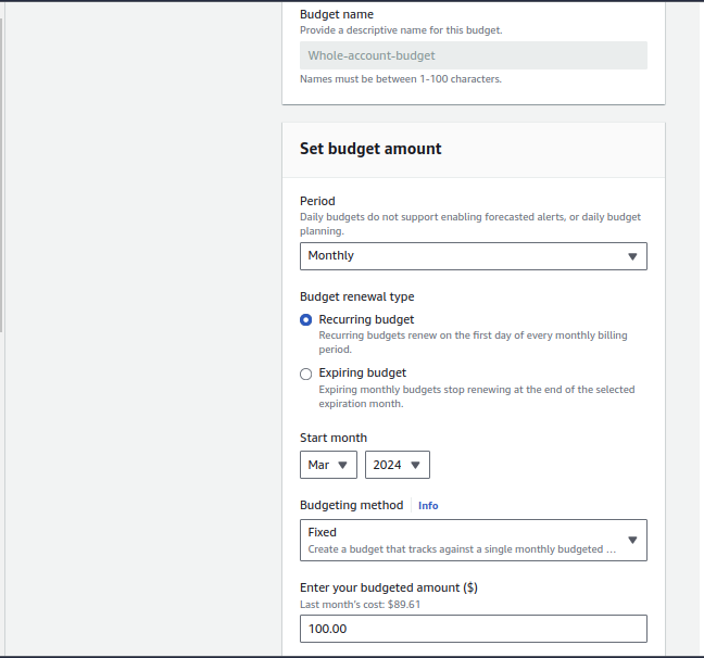 - The Cost Budget type, it’s like the monthly whole account cost budget, which will notify us if/when the actual costs of whole account services exceed the specified budgeted amount.