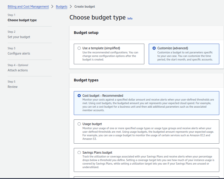 - Budget templates are a simplified way to start using AWS Budgets, with a single page workflow, unlike the 5-step workflow that is required for Customizing a budget (advanced).