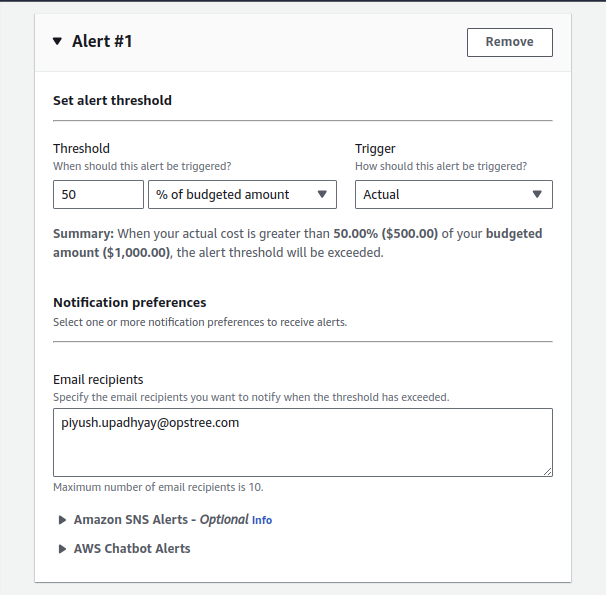 With AWS Budgets, set custom budgets to track your costs & usage and respond quickly to alerts received from email or SNS notifications if you exceed your threshold.