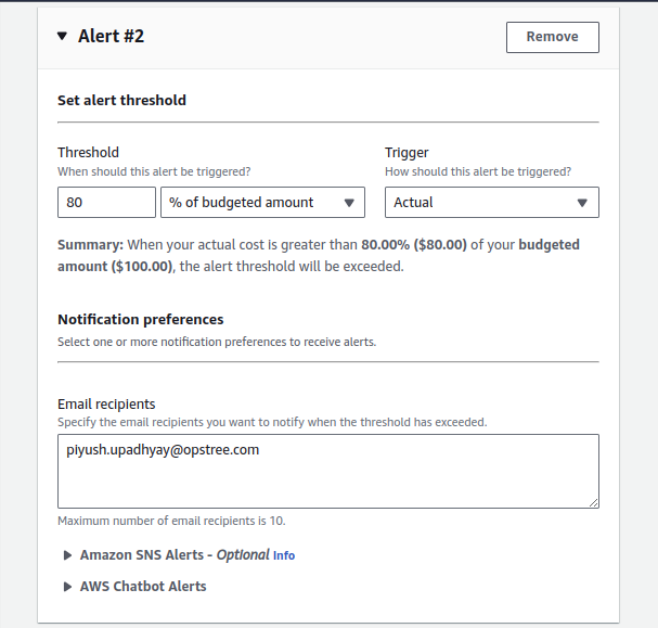 As a best practice, add an alert threshold when your actual budget goes about 50%, 60% and 70%.