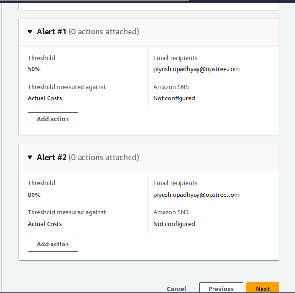 Click Next and here you can attach actions that can be taken when your budget exceeds its threshold. We will not be attaching any actions for this lab. Select Next to move to the next page: