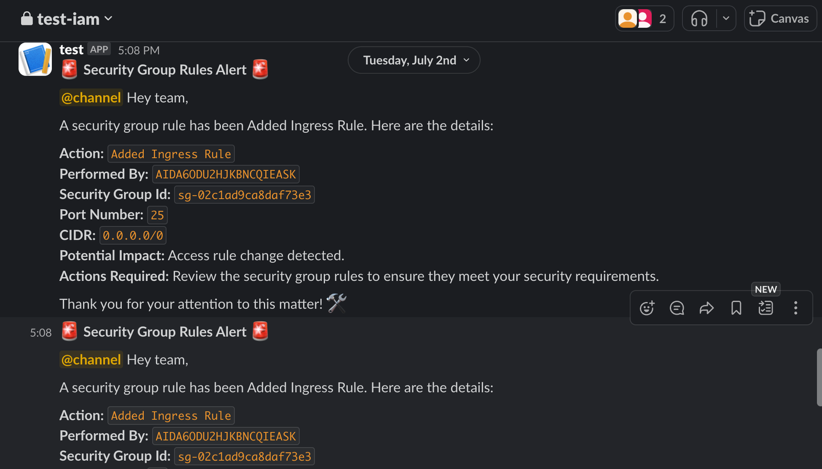 send_alert(sg_id, username, to_port, cidr, action)