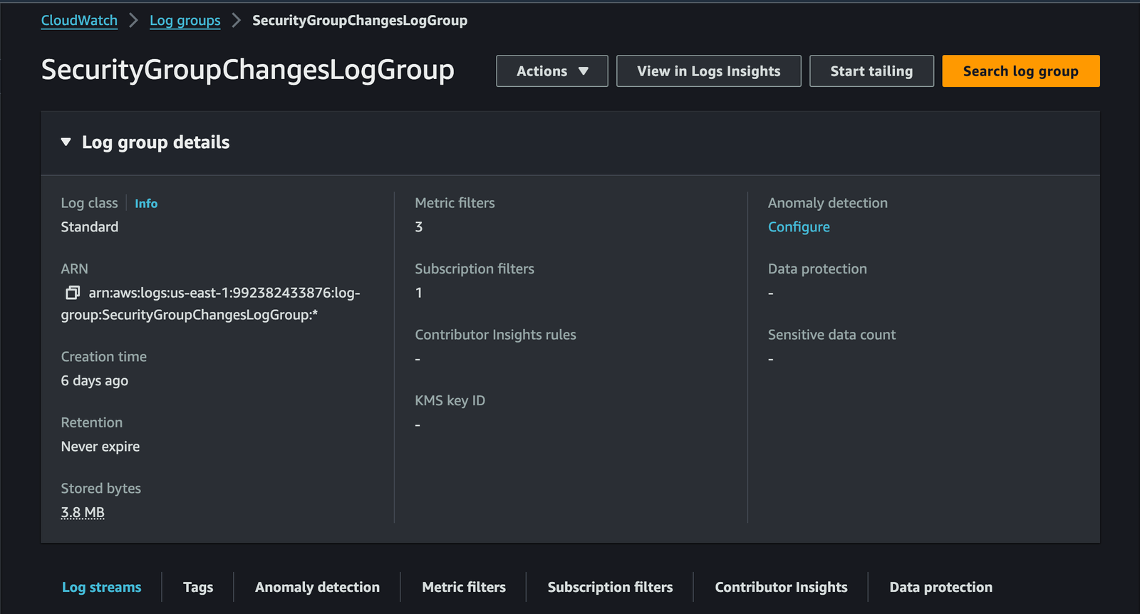 - Create a new log group or use an existing one to receive CloudTrail logs