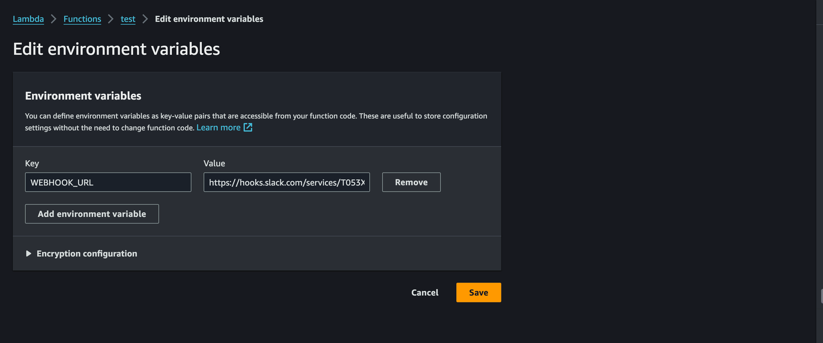 - Set the WEBHOOK_URL environment variable to the Slack webhook URL you created.