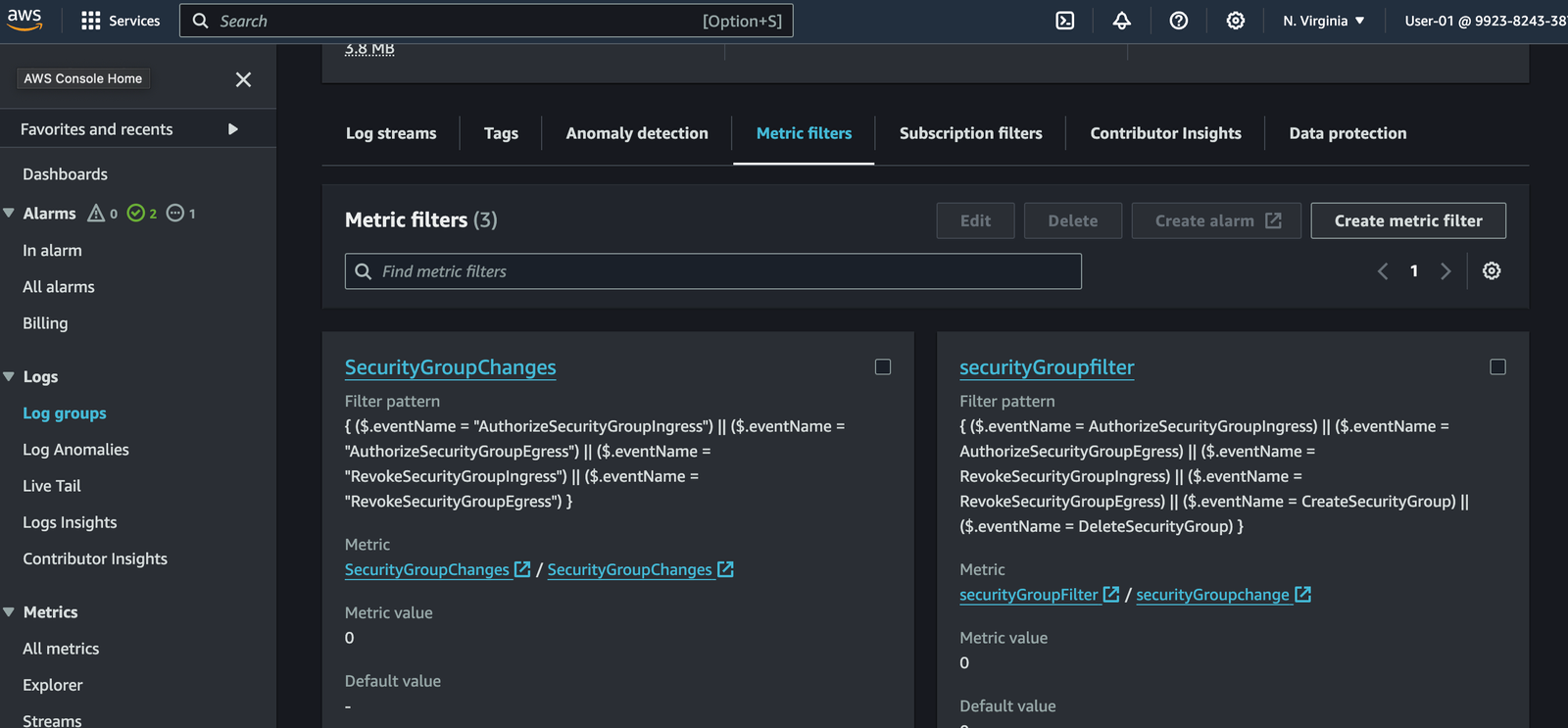 - Choose the log group that contains the CloudTrail logs.